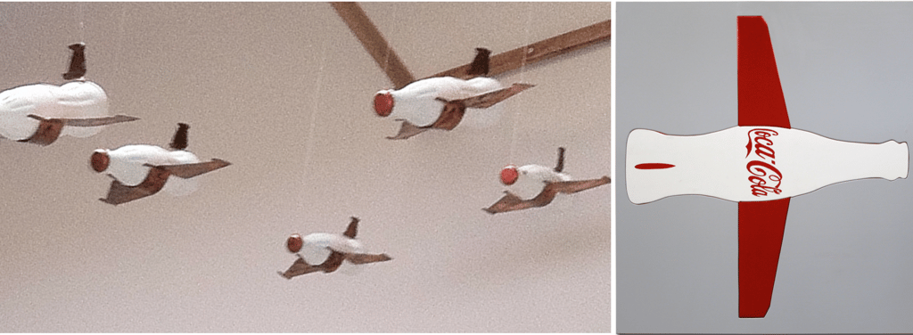 Drawing further inspiration from the spirit of Arte Povera and the playful recontextualization I admire in Manzoni and Pistoletto, other works in this series similarly explore the appropriation of corporate icons, the symbology of warfare, and the pervasive influence of Mass Media campaigns. This is evident in pieces featuring Coca-Cola planes and jet formations, often enhanced with the inclusion of sound effects and voice-overs to amplify their impact. A large, hand-painted red light box, depicting the plane as a promotional tool for a 'war endeavor,' further embodies this theme, alongside the inclusion of a rocket sculpture and mixed media paintings.