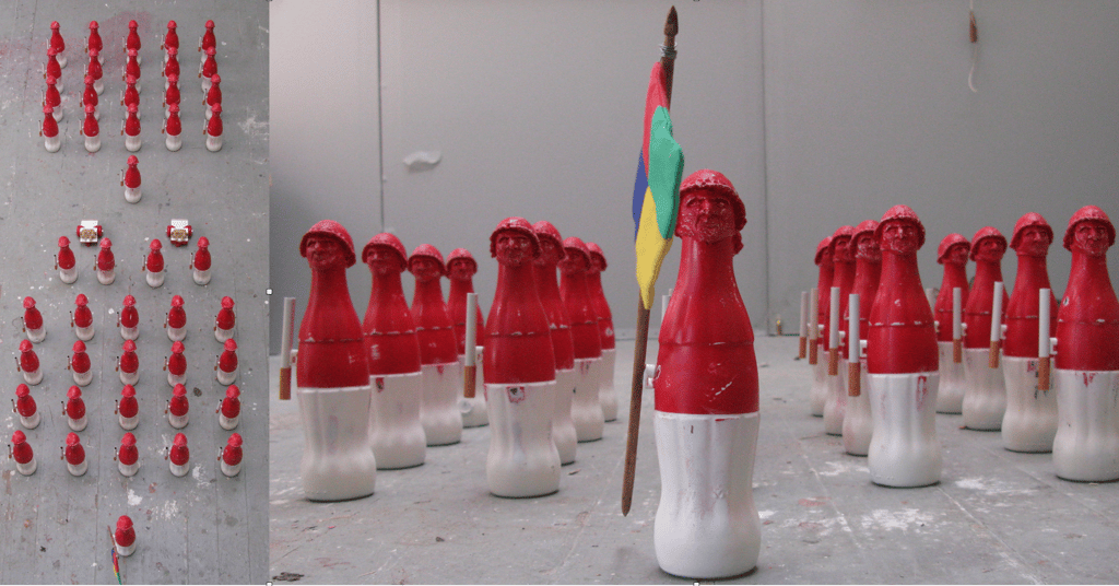 The Giovanni CocaCola formation includes a series of fifty 'infantry' soldiers and a 'six-pack' of 'elite' troops. Each soldier is constructed from a repurposed classic 8oz Coca-Cola bottle and topped with the distinct Giovanni head and helmet mold. The 'infantry' edition adheres to the iconic Coca-Cola color palette, featuring a red helmet, head, and torso, contrasted by a white bottom bearing distressing from battle. In stark distinction, the 'elite' troops are rendered entirely in black with a silver helmet. Notably, each soldier carries a faux cigarette, acting as a shoulder rifle. This inclusion serves as an exploration of the symbolic nature of weapons in warfare and subtly integrates a partnering corporate entity. The infantry set is further augmented by two Marlboro cigarette cannons and a Microsoft flag bearer.