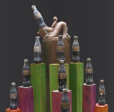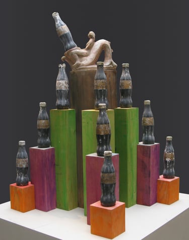 I had always been fascinated by Giorgio Morandi’s still life compositions of bottles, which were described as “miniature modern skyscrapers. . . ” and I had taken on the bottle subject for many of my sculptures in the past with the same metaphysical nature as in his paintings. The creation of the character Giovanni CocaCola was the progression of my play with found objects and the recontextualization of iconic symbols, blended with personification and a political story.